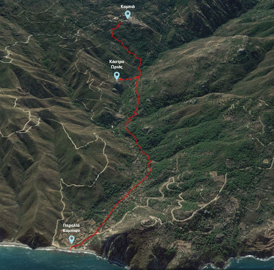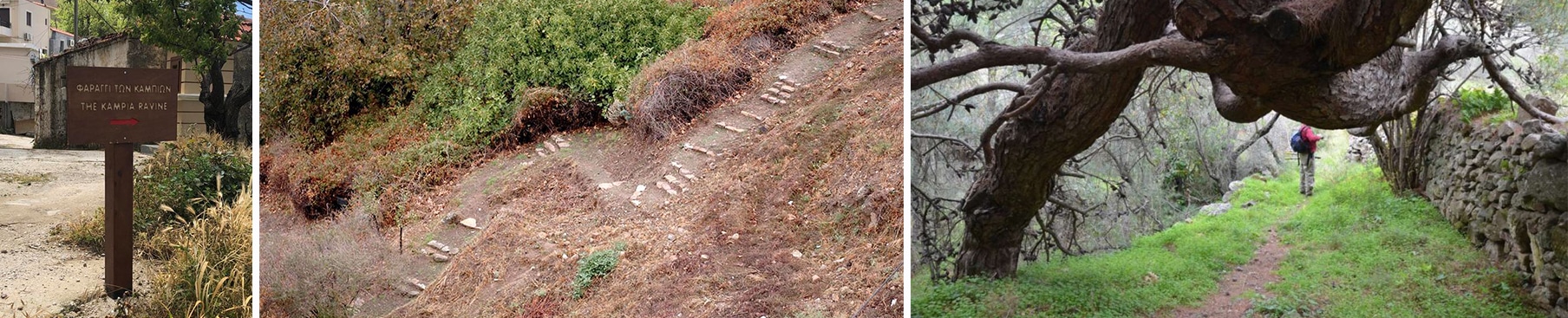 Το μονοπάτι ξεκινά μετά το τελευταίο σπιτι. Το σημείο προσφέρει πανοραμική θέα προς τα βουνά που το περιβάλλουν, προς το κατάφυτο φαράγγι των Καμπιών, αλλά και προς τη θαλάσσια περιοχή του Αιγαίου μεταξύ Χίου και Λέσβου. Μία κομψή ξύλινη πινακίδα μας ενημερώνει για την υψομετρική διαφορά (330 μ.), την απόσταση (3.370 μ.) και το χρόνο πορείας (90 λεπτά, αισιόδοξα) και μας πληροφορεί ότι η αποκατάσταση και σηματοδότηση του μονοπατού χρηματοδοτήθηκε από την Ευρωπαϊκή Ενωση.