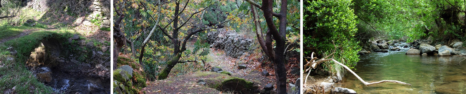 Καθώς συνεχίζουμε την πορεία μας, το μονοπάτι αρχίζει πάλι να κατηφορίζει και σε λίγο συναντά ξανά το ποτάμι. Στο σημείο αυτό, όπου τα εντυπωσιακά κυπαρίσσια κυριαρχούν, υπάρχει ένα μικρό φράγμα, από το χείλος του οποίου ξεκινά το πέτρινο αρδευτικό αυλάκι που οδηγεί το νερό στα γύρω περιβόλια. Λίγο παρακάτω θα συναντήσουμε ένα ακόμα γεφύρι. Περνάμε απέναντι, έχοντας και πάλι την κοίτη στα αριστερά μας. Βαδίζουμε δίπλα στο ποτάμι με τις ξερολιθιές στα δεξιά μας. Δίπλα μας, το αρδευτικό αυλάκι μοιράζει στο διάβα του νερό στα χωράφια με τα εσπεριδοειδή.