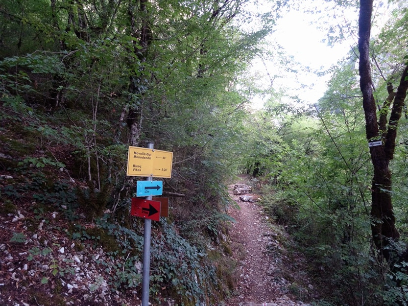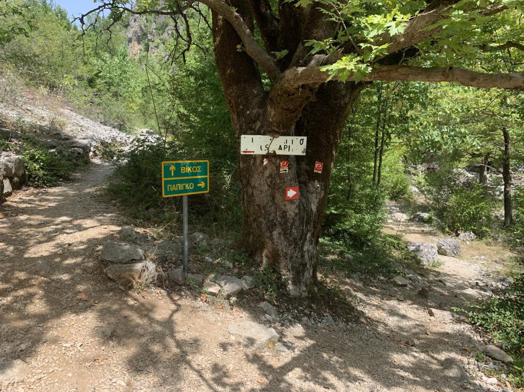Σε λίγο το μονοπάτι αρχίζει να κατηφορίζει απότομα (σε μορφή σκάλας) και για περισσότερη από μισή ώρα θα δοκιμάσει τις δυνάμεις μας, μέχρι να μας φέρει στον πυθμένα του φαραγγιού, όπου τεράστιοι βράχοι μας υποδέχονται. Εδώ υπάρχει ενημερωτική πινακίδα που υποδεικνύει την πορεία μας προς το χωριό Βίκος (Βιτσικό)
