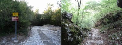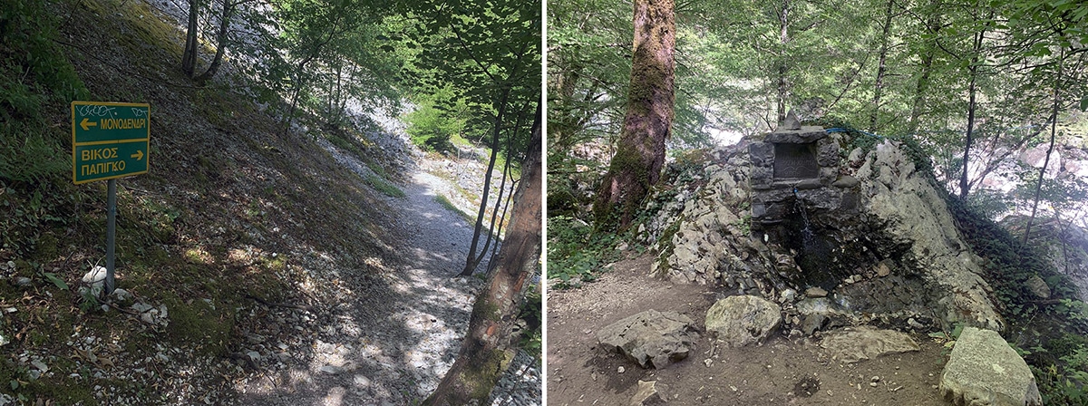 Η ενημερωτική πινακίδα στην αρχή του μονοπατιού (αριστερά) & το απότομο μονοπάτι προς την κοίτη του φαραγγιού (δεξιά)