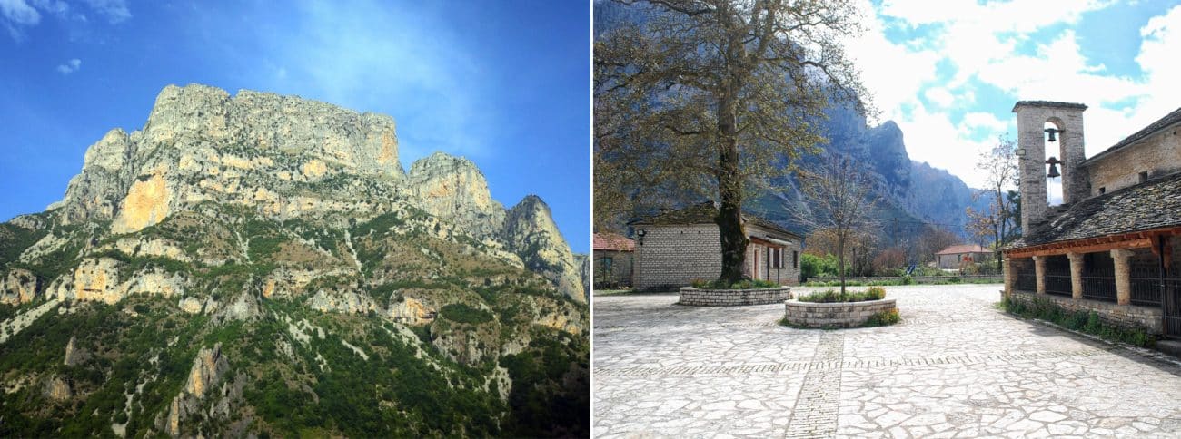 Οι πύργοι του Πάπιγκου όπως φαίνονται από το Βιτσικό (αριστερά). Η κεντρική πλατεία του Βιτσικού (δεξιά)