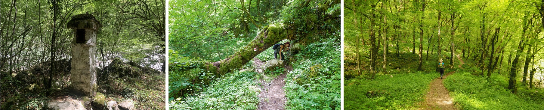 Μία επιπλέον ώρα από το Κλήμα, έχοντας αφήσει πίσω μας τα πιο απαιτητικά σημεία του μονοπατιού, συναντάμε το εικονοστάσι της Αγίας Τριάδας και αρχίζουμε να κινούμαστε σε ομαλό πεδίο, μέσα σε πυκνό δάσος από βελανιδιές, γαύρους και οστριές που εναλλάσσονται με μικρά ξέφωτα με θέα τις πανύψηλες, κάθετες πλαγιές της Αστράκας με τα εντυπωσιακά ζωνάρια και τα κοιλώματα που μοιάζουν με μεγάλες σπηλιές. Στα πλατώματα της διαδρομής, τα πολυάριθμα τοιχία και οι γκρεμισμένες πεζούλες μαρτυρούν την έντονη ανθρώπινη δραστηριότητα μέσα στην χαράδρα στο παρελθόν.