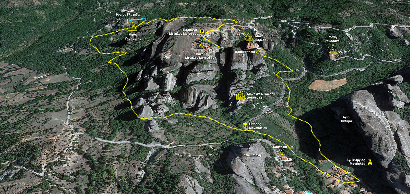 Μετέωρα : Καστράκι – Ντούπιανη – Μονή Υπαπαντής – [ Μνημείο Βλαχάβα ] – Μεγάλο Μετέωρο – Μονή Βαρλαάμ – Άγιος Γεώργιος Μαντηλάς – Καστράκι (κυκλική)