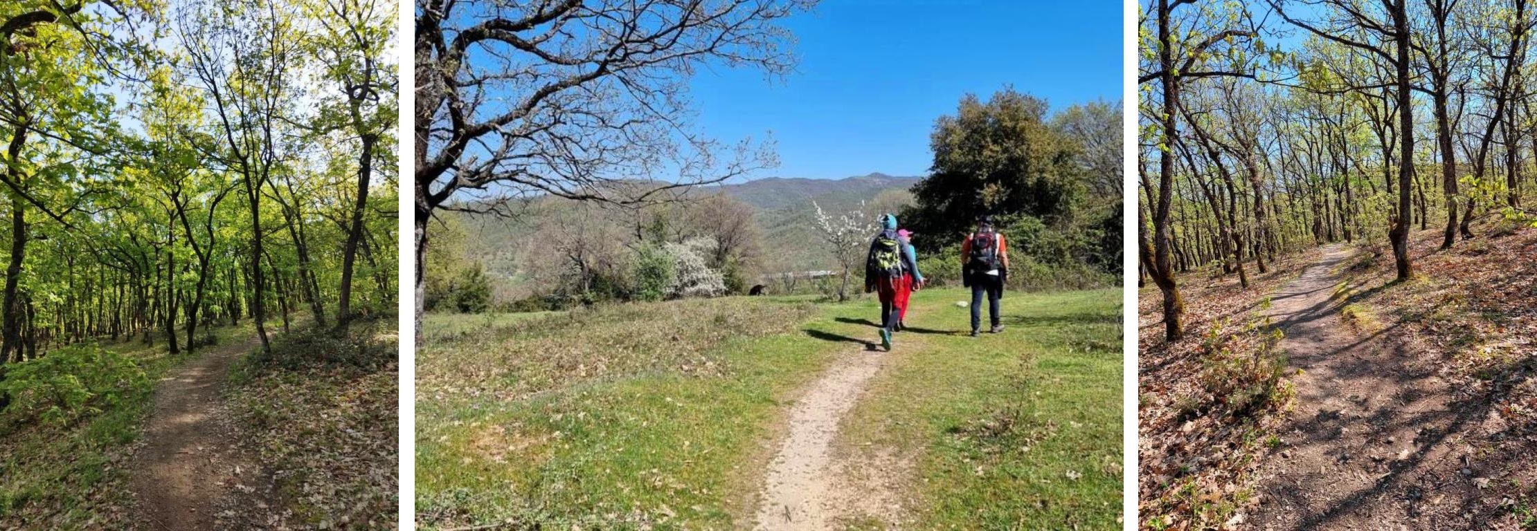 Το μονοπάτι ανεβαίνει, περνά ανάμεσα στα βράχια και στη συνέχεια στρέφεται βορειοανατολικά και μας οδηγεί στην καρδιά του καταπράσινου δάσους. Βαδίζουμε πότε σε δάσος και πότε σε ξέφωτα, έχοντας τους βράχους στα δεξιά μας, χωρίς ιδιαίτερες κλίσεις.Καθώς φτάνουμε στους τελευταίους βράχους, το μονοπάτι ανηφορίζει και πάλι, ώσπου συναντά χωματόδρομο, τον οποίο ακολουθούμε δεξιά. Μέχρι εδώ έχουμε περπατήσει περίπου 1 ώρα από την Ντούπιανη.