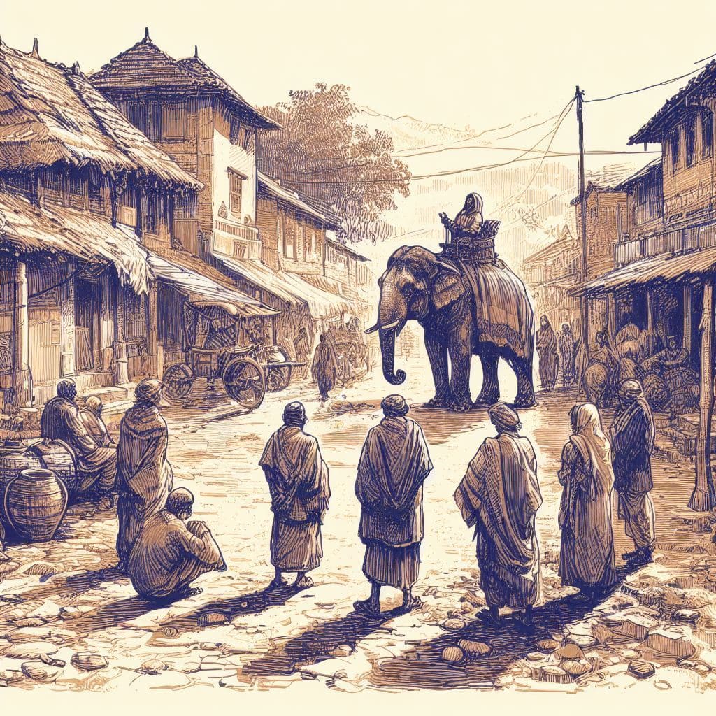 Μια φορά κι έναν καιρό, σε ένα χωριό της Ινδίας ζούσαν ένας τυφλός μαχαραγιάς και έξι σοφοί άνθρωποι, επίσης τυφλοί. Οι συγχωριανοί τους τούς σέβονταν και τους βοηθούσαν.