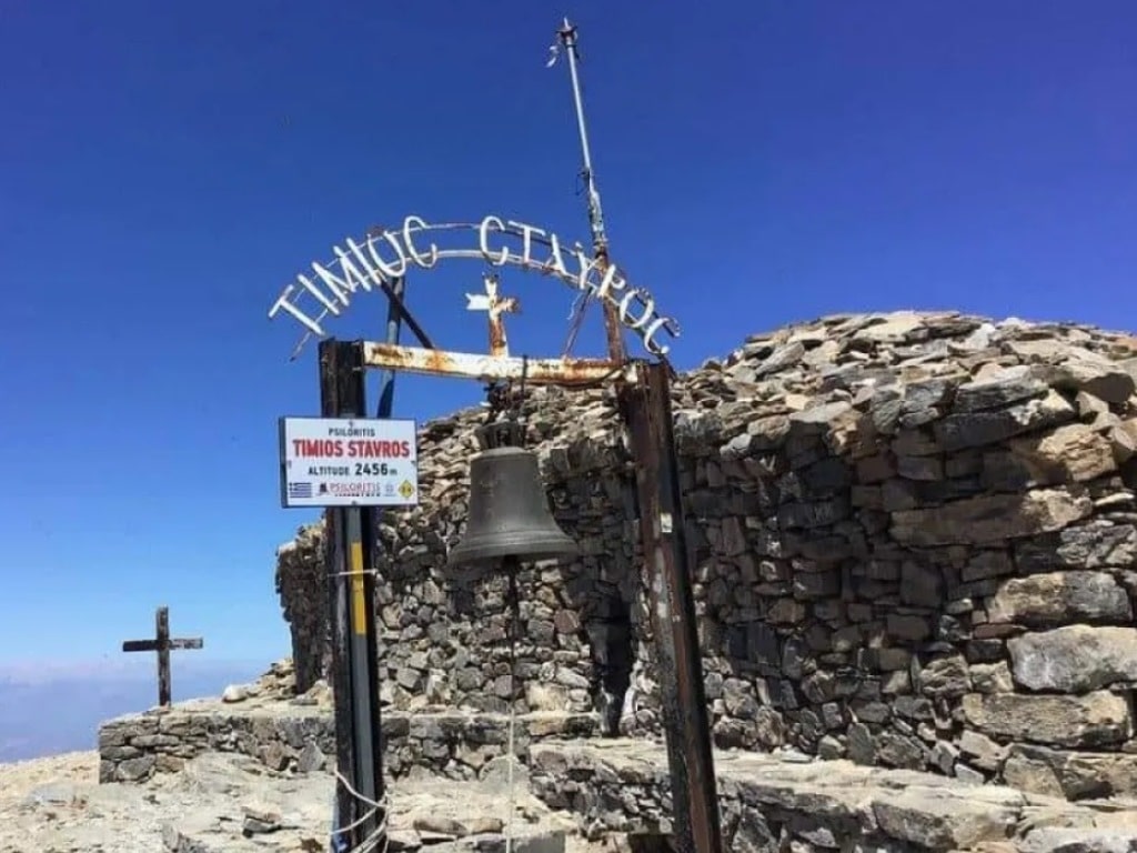 Η τελευταία “κόντρα” προς την κορυφή – Η κορυφή με την χαρακτηριστική πινακίδα και το ξωκλήσι του Τίμιου Σταυρού