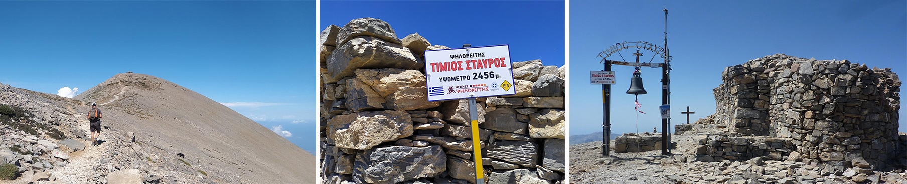 Κάποια στιγμή το μονοπάτι μας θα γίνει κοινό με αυτό του διεθνούς μονοπατιού Ε4. Μετά από λίγο θα φτάσουμε στην κορυφή Τίμιος Σταυρός, όπου βρίσκεται το ομώνυμο εκκλησάκι και αποτελεί το τέλος της διαδρομής. Στην κορυφή βρίσκεται και ένα πηγάδι που γεμίζει από τις βροχές και τα χιόνια. Από την κορυφή μπορούμε να δούμε το μεγαλύτερο μέρος της Κρήτης και ανάλογα με τις συνθήκες και κάποια ακόμα νησιά του Αιγαίου. Η ανάβαση διαρκεί περίπου 3:00 – 3:30 ώρες.