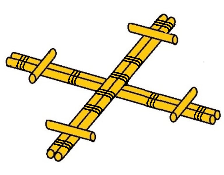 Βήμα 2. Κατασκευάζουμε τον σταυρό, με 4 ξύλα x 3 m και 4 ξύλα x 0,80 m για χειρολαβές (βλ. σχήμα). Τα ξύλα δένονται ανά 2 με παράλληλες συνδέσεις και στο κέντρο τα ζεύγη με σταυροειδή.